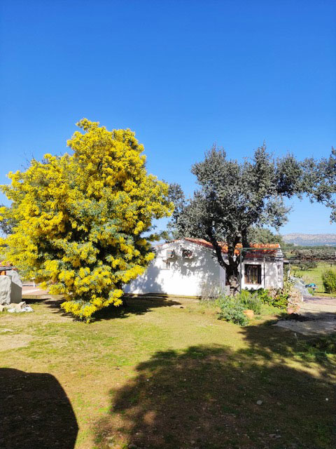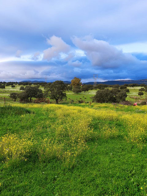 El acceso es cómodo por camino de tierra en buen estado y la finca está atravesada por un arroyo que fluye gran parte del año, ofreciendo además vistas abiertas a la montaña y un entorno de encinas que reflejan la esencia de la dehesa extremeña.